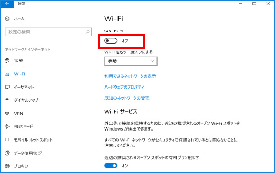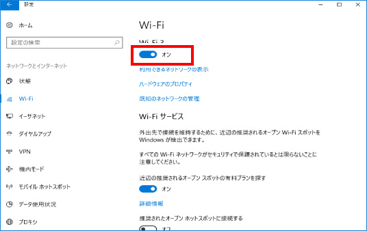 また、機内モードがオフでもワイヤレスデバイスの中にある「Wi-Fi」がオフになっている場合はクリックをして「オン」にします。この状態になりましたら、一度正常に無線LANができるかどう確認をします。