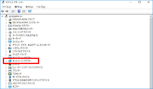 デバイスマネージャーという画面が表示されたら、ネットワークアダプターと書かれた文字の左にある「>」をクリックします。