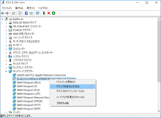 もし「デバイスを有効にする」になっている場合は、クリックをし正常に無線LANに繋がるか確認をします。