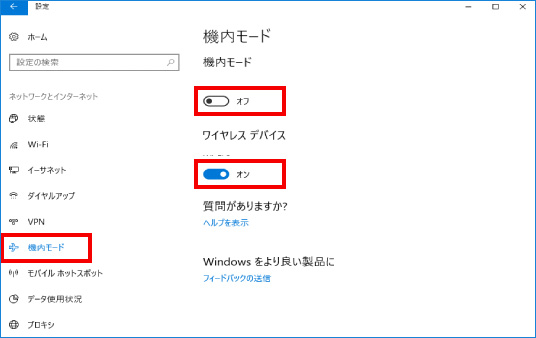 「機内モード」がオンになっている場合は、オンの文字をクリックし「オフ」にします。