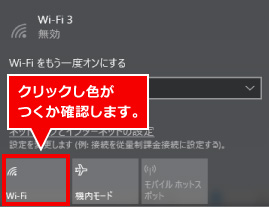 のアイコンをクリックして、Wi-Fiの項目に色がついていない場合はクリックを行い、その後Wi-Fiの項目に色がついた状態で無線LAN接続ができるかどうか確認します。