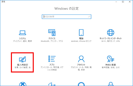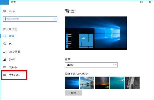 ② 設定画面の中から「個人用設定」をクリックし、「タスクバー」をクリックします。
