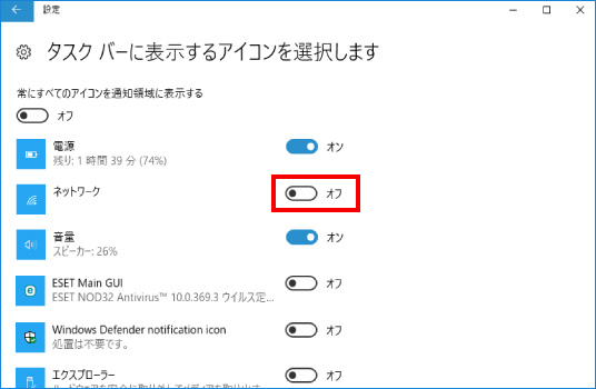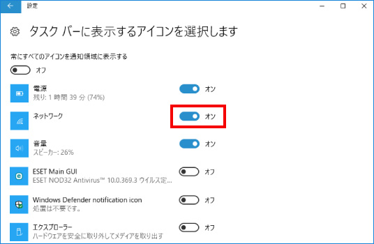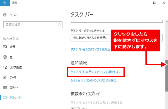 ③ 表示された画面の右端にマウスの矢印をあわせ、灰色のバー(つまみ)をクリックしたまま「通知領域」という項目が表示されるまで下に動かします。通知領域の下にある「タスクバーに表示するアイコンを選択します」をクリックし、ネットワークの項目をクリックして「オフ」を「オン」に操作は完了です。