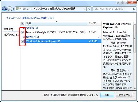 - 更新プログラムの一覧が表示されますので、インストールしたい更新プログラムにチェックを入れ、インストールしない更新プログラムはチェックを外してから[OK]をクリックします。